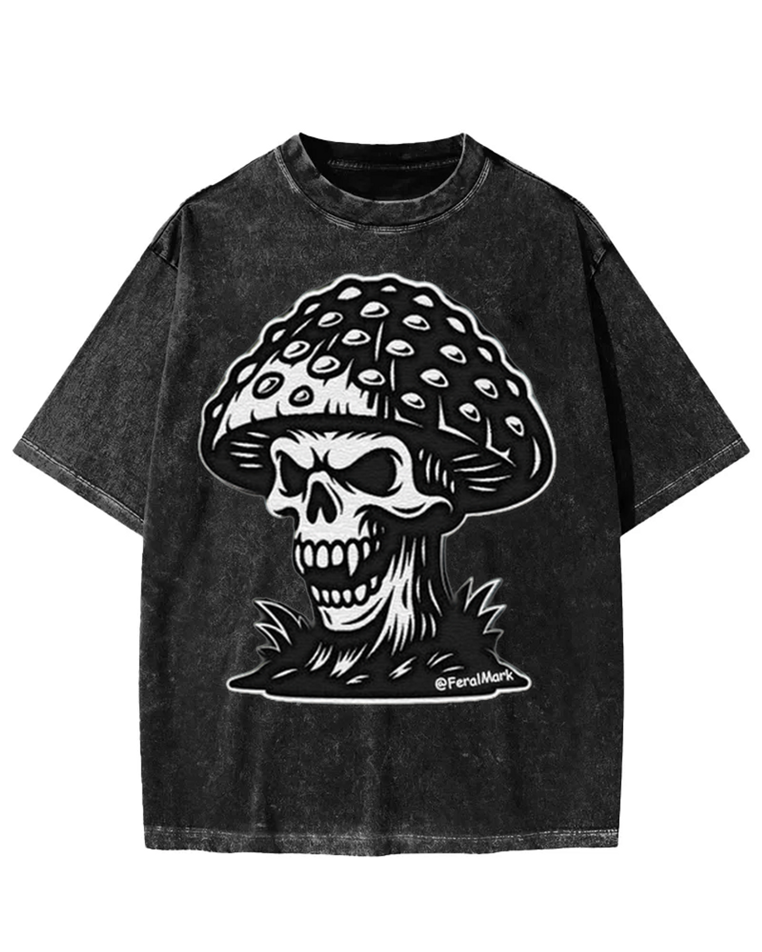 Dark Psychedelic Skull Mushroom Graphic Washed T-shirt