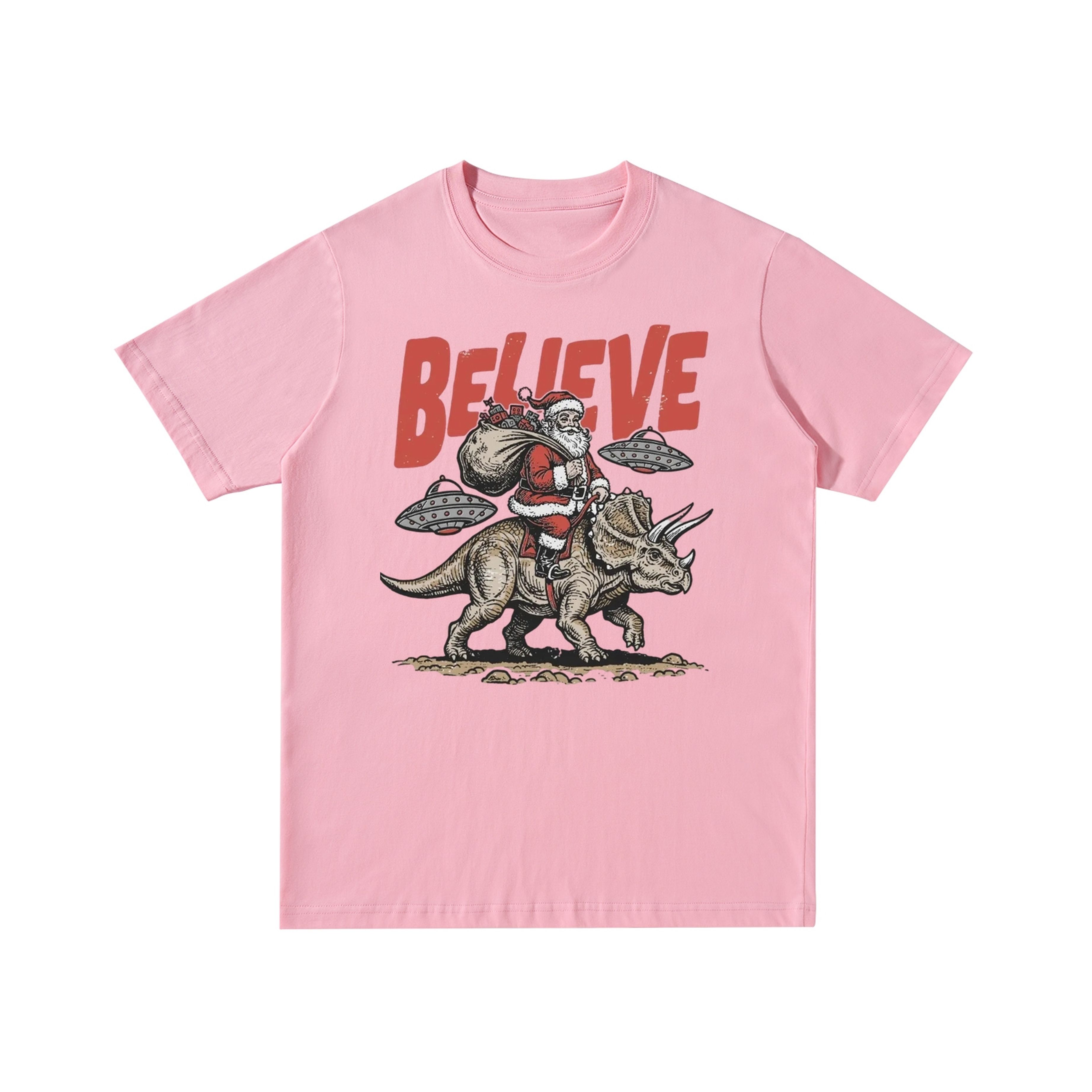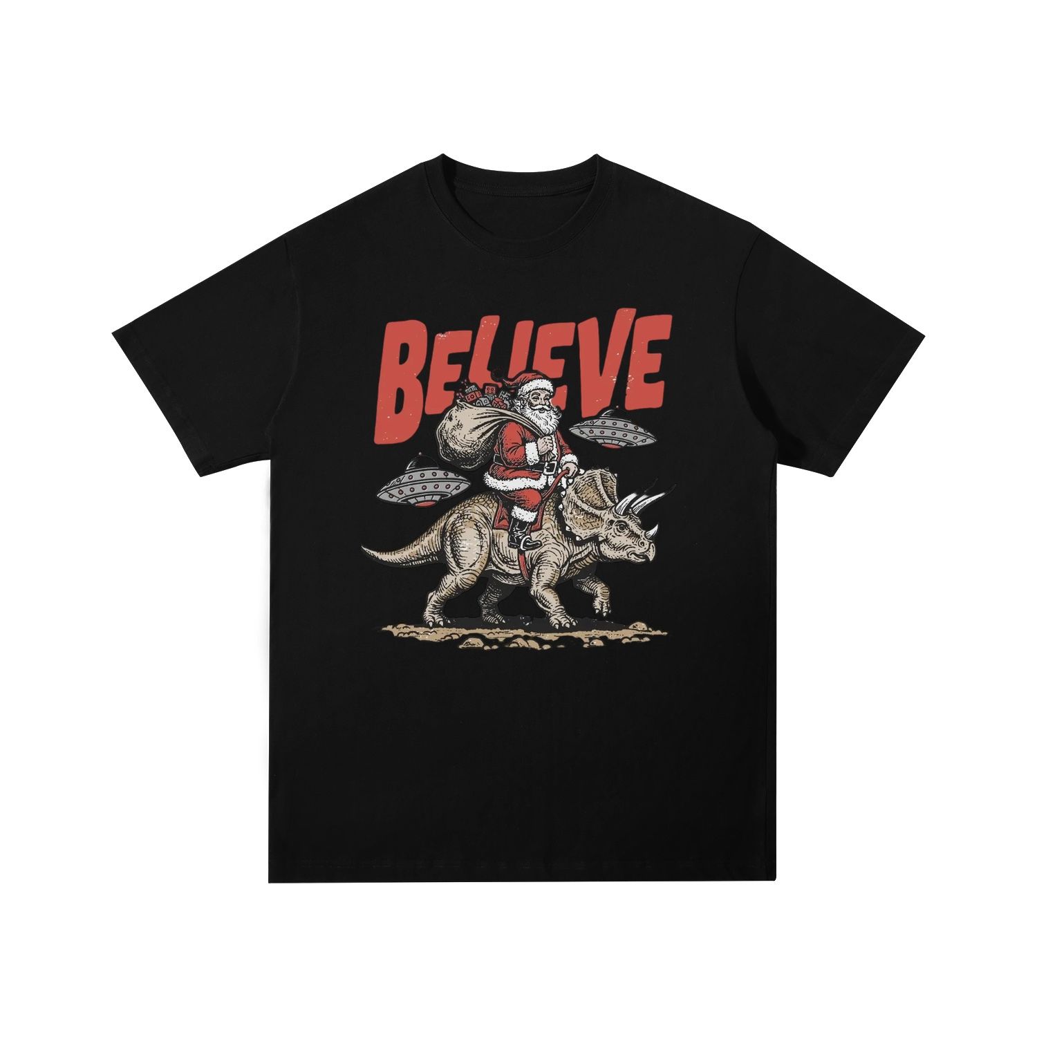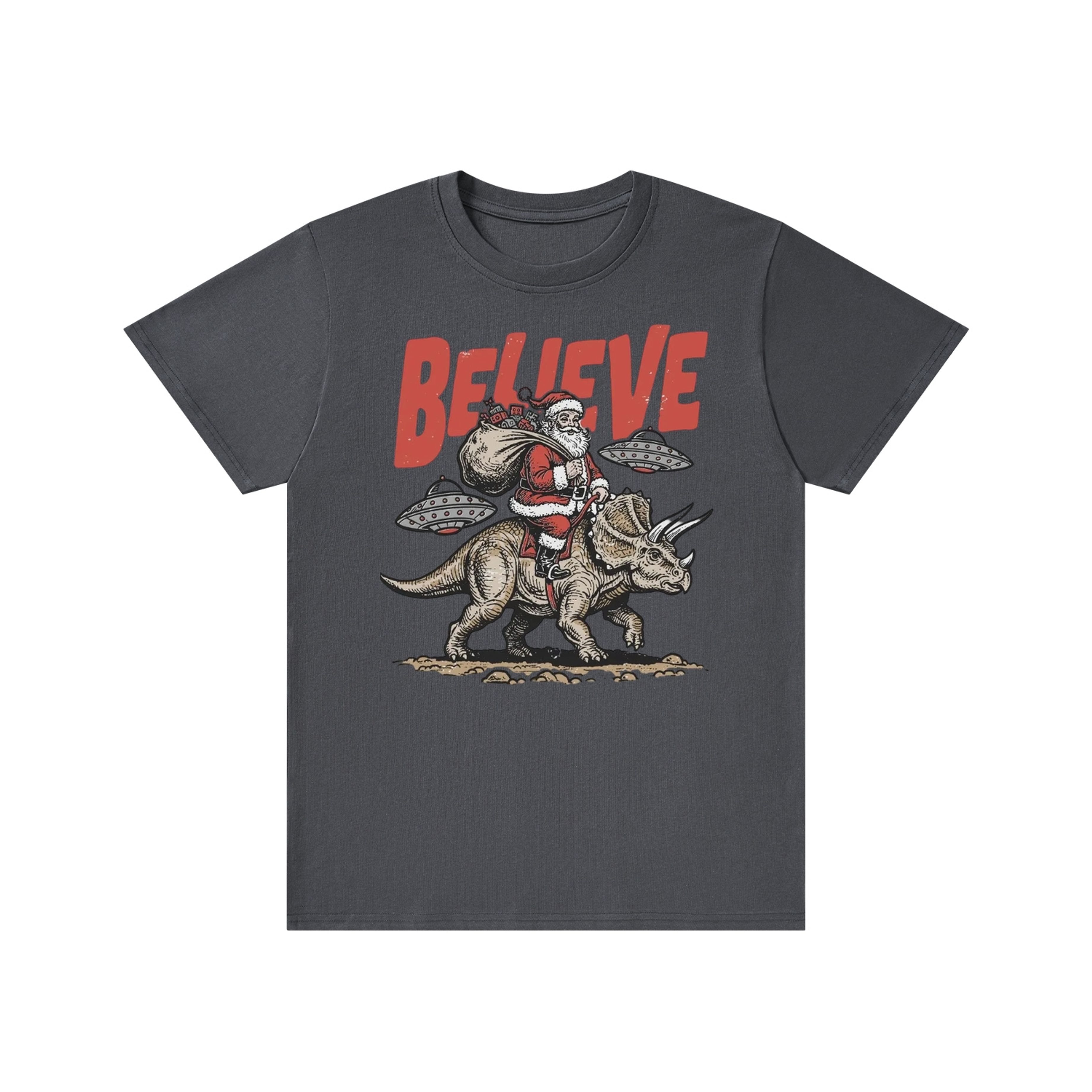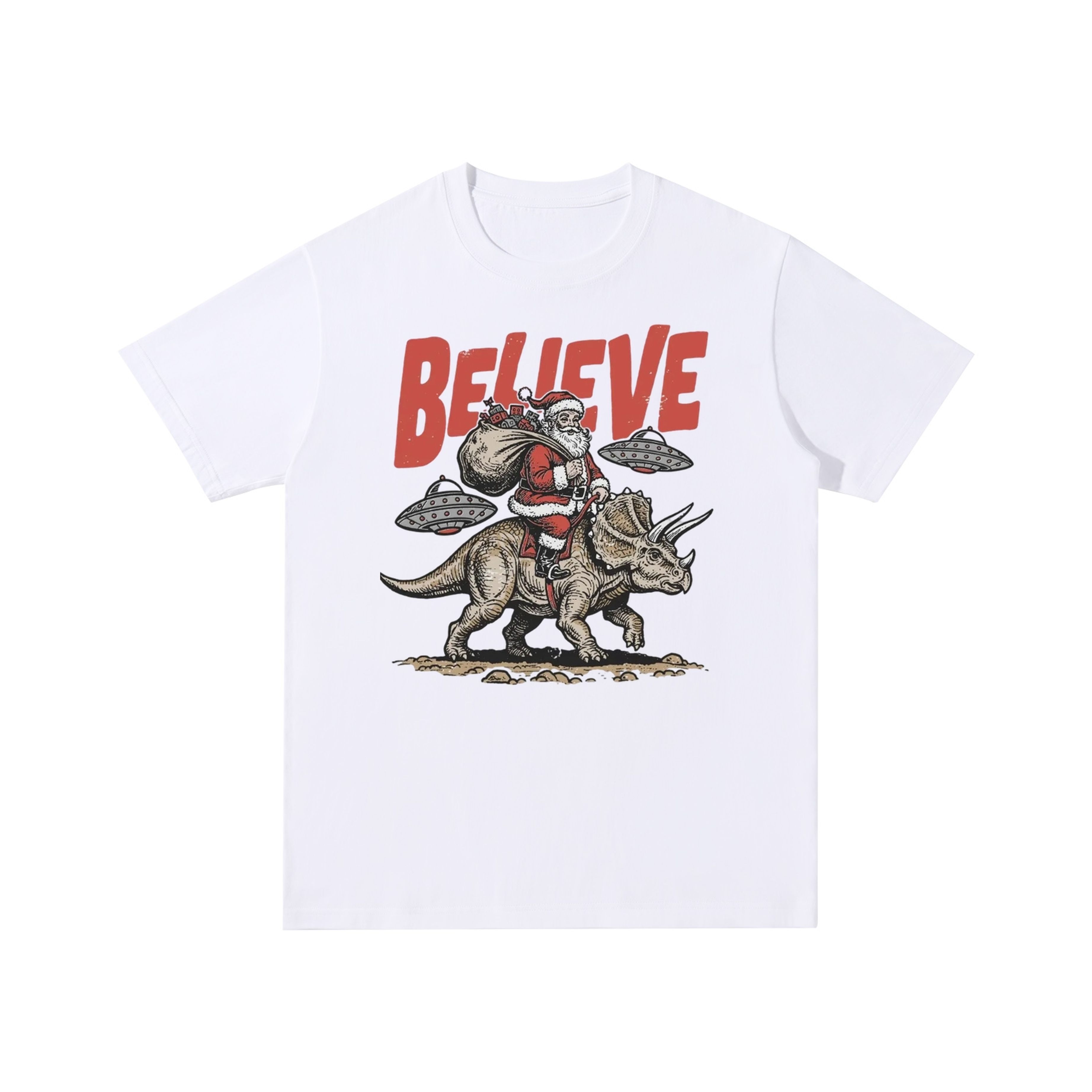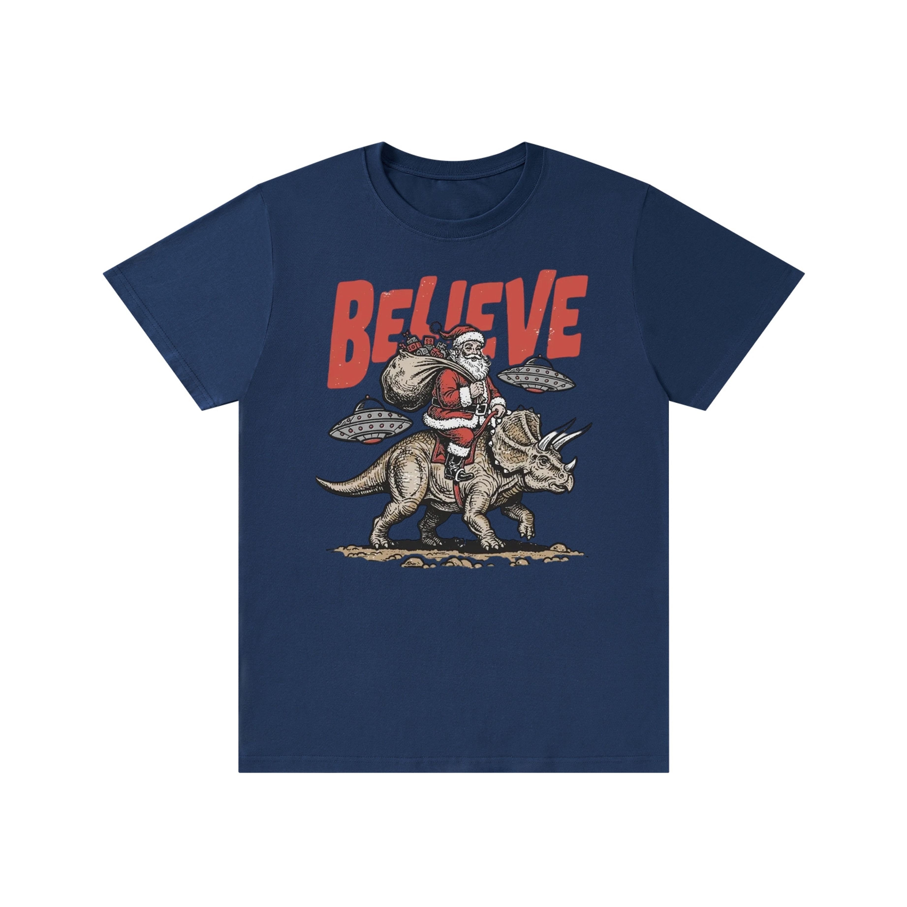 Santa on Triceratops with UFOs Cotton T-Shirt