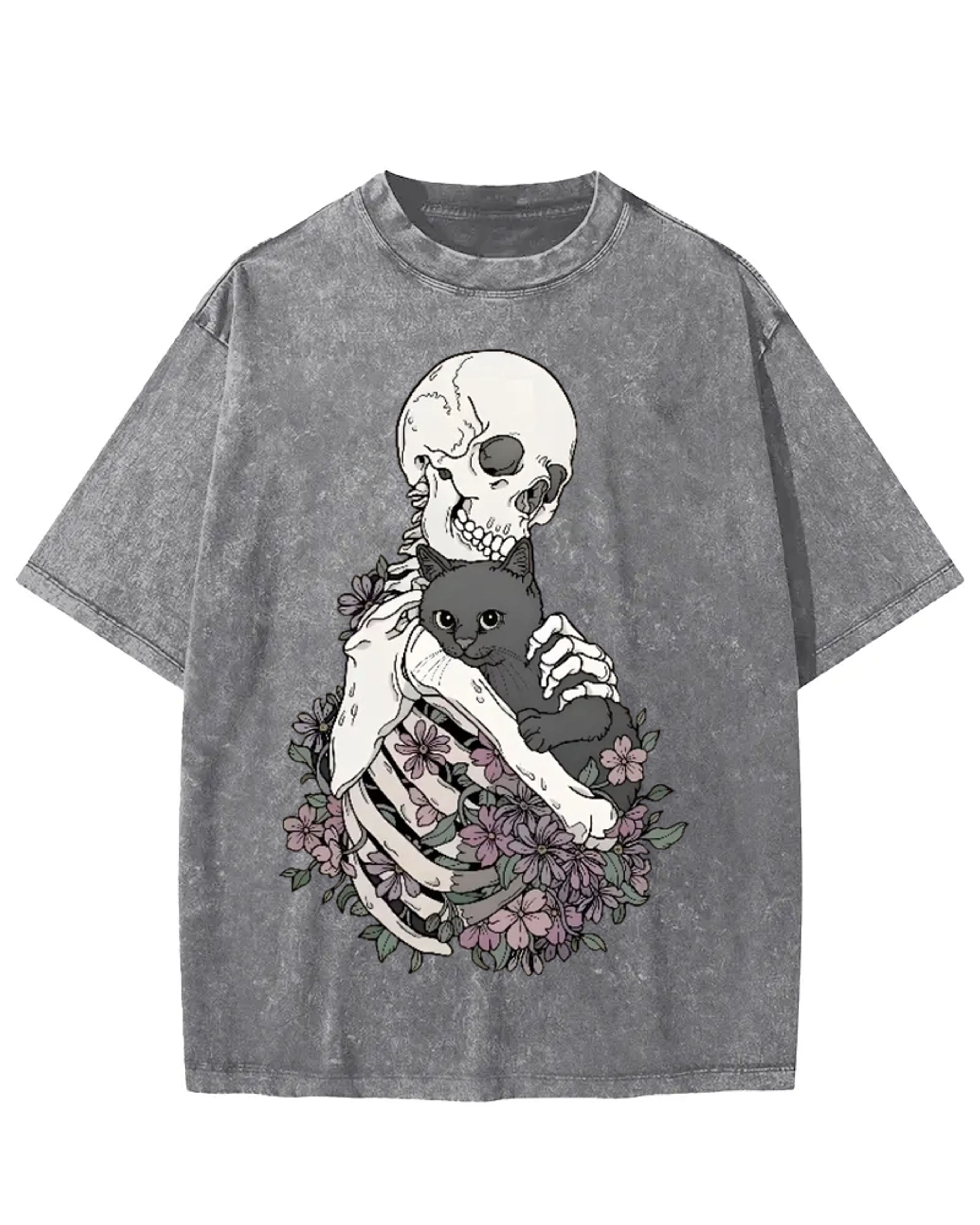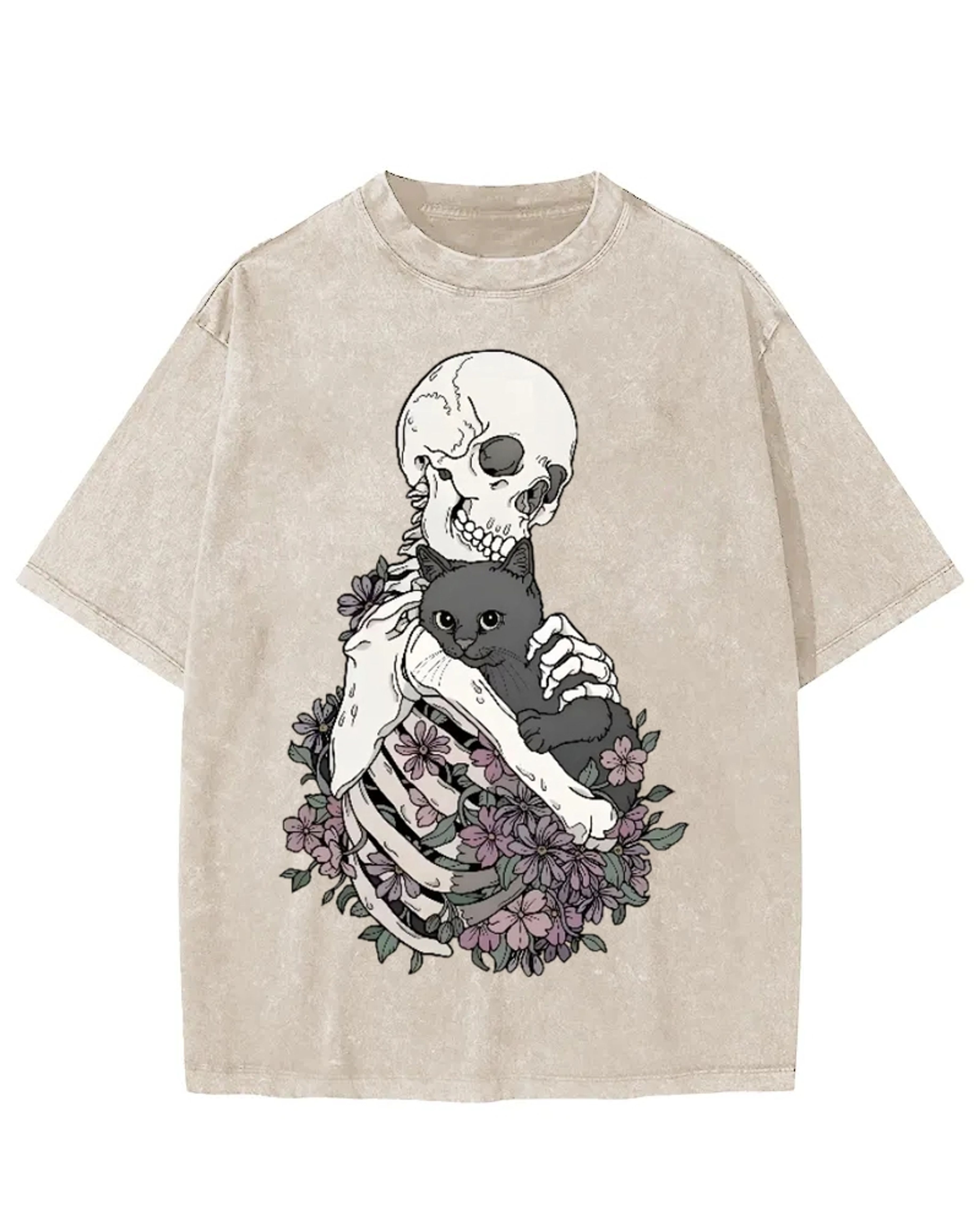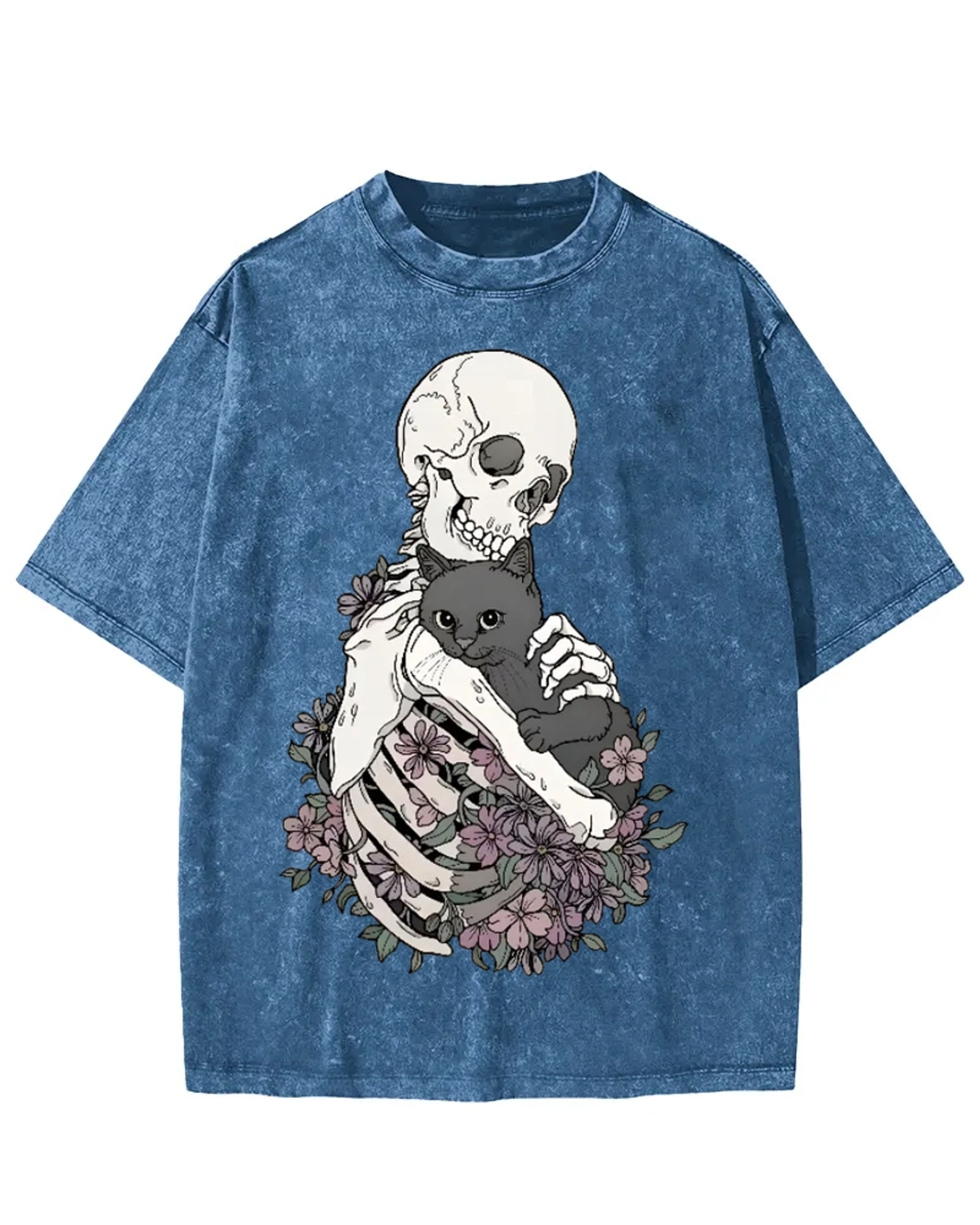 Skeleton Hugging Black Cat with Flowers Washed T-Shirt