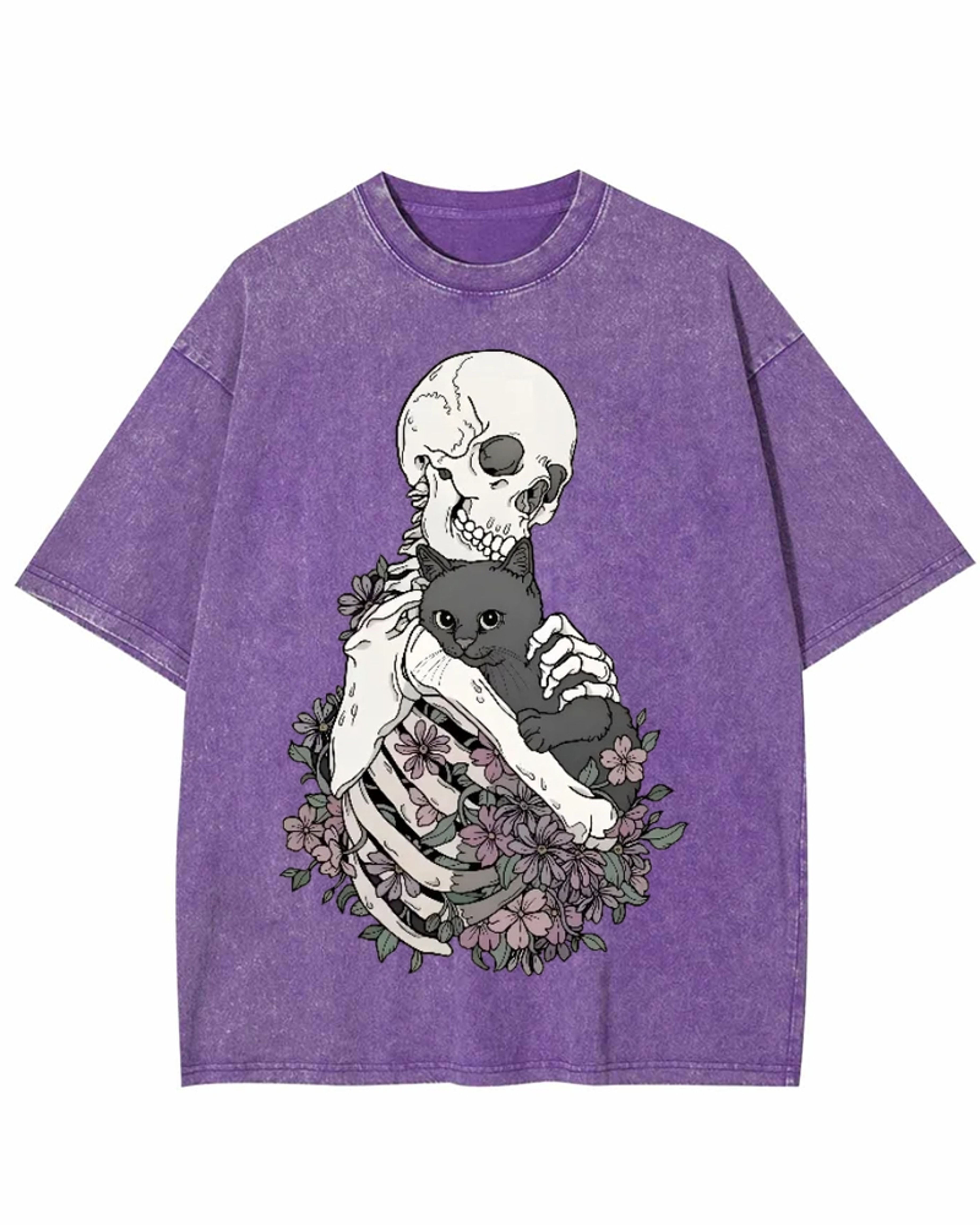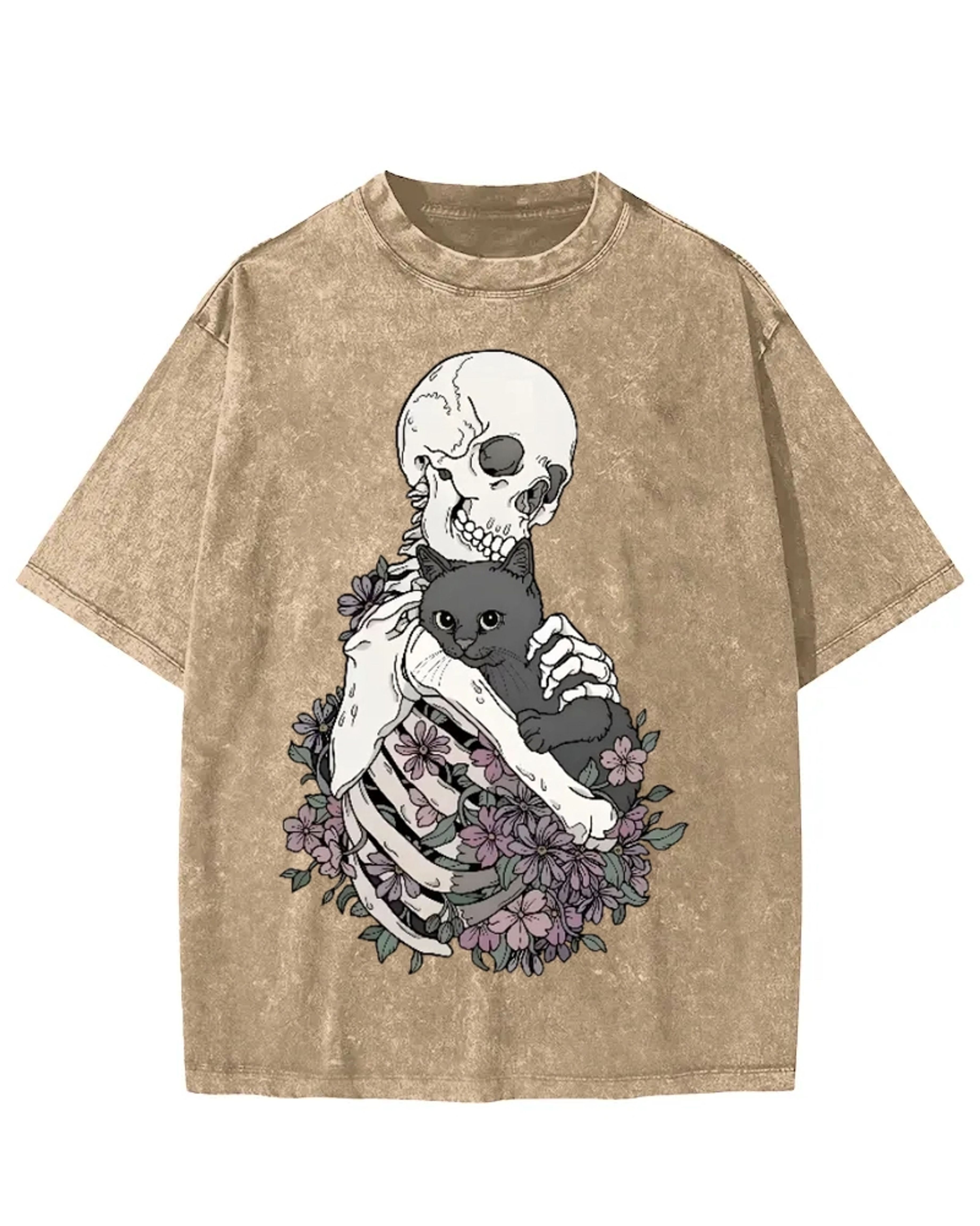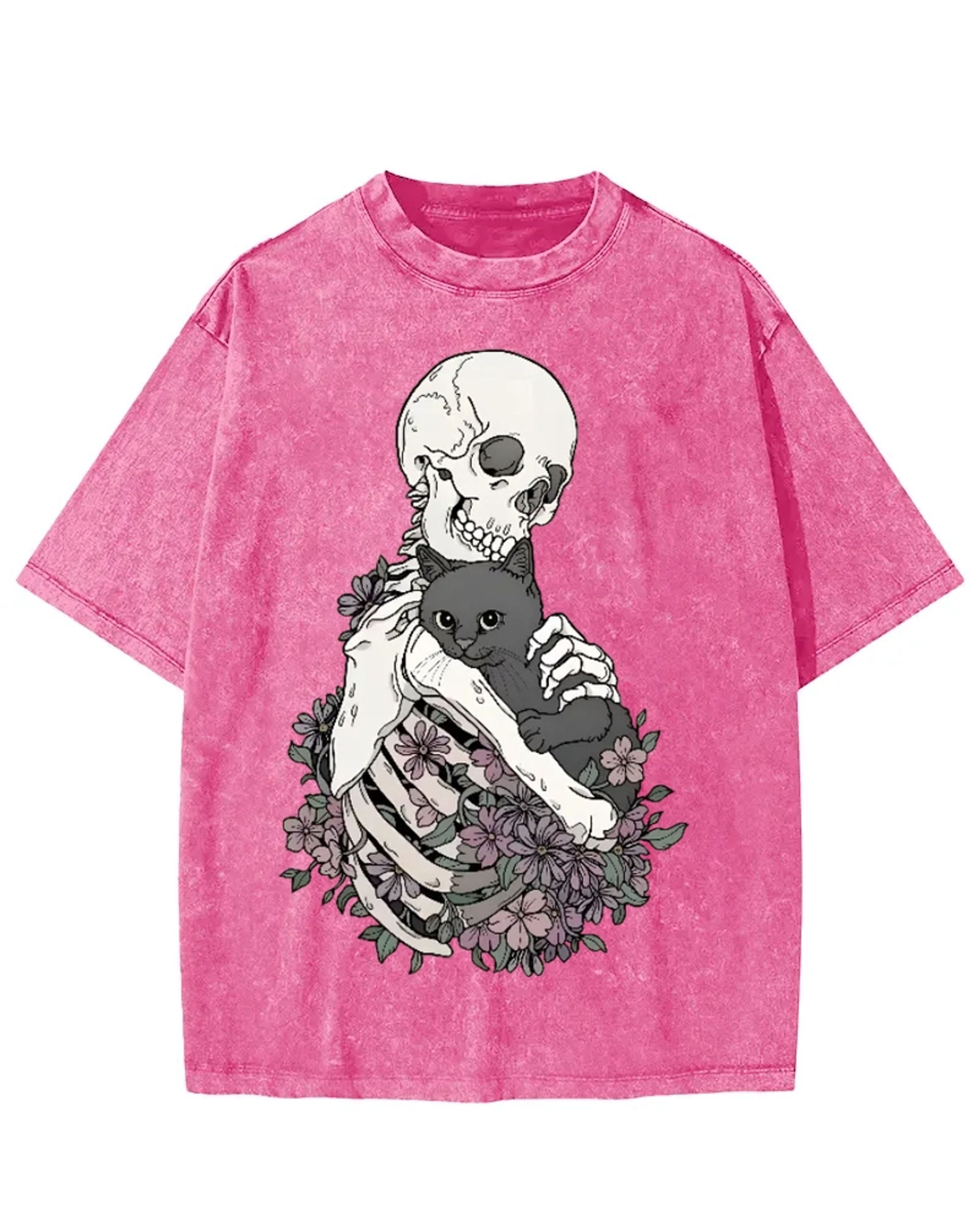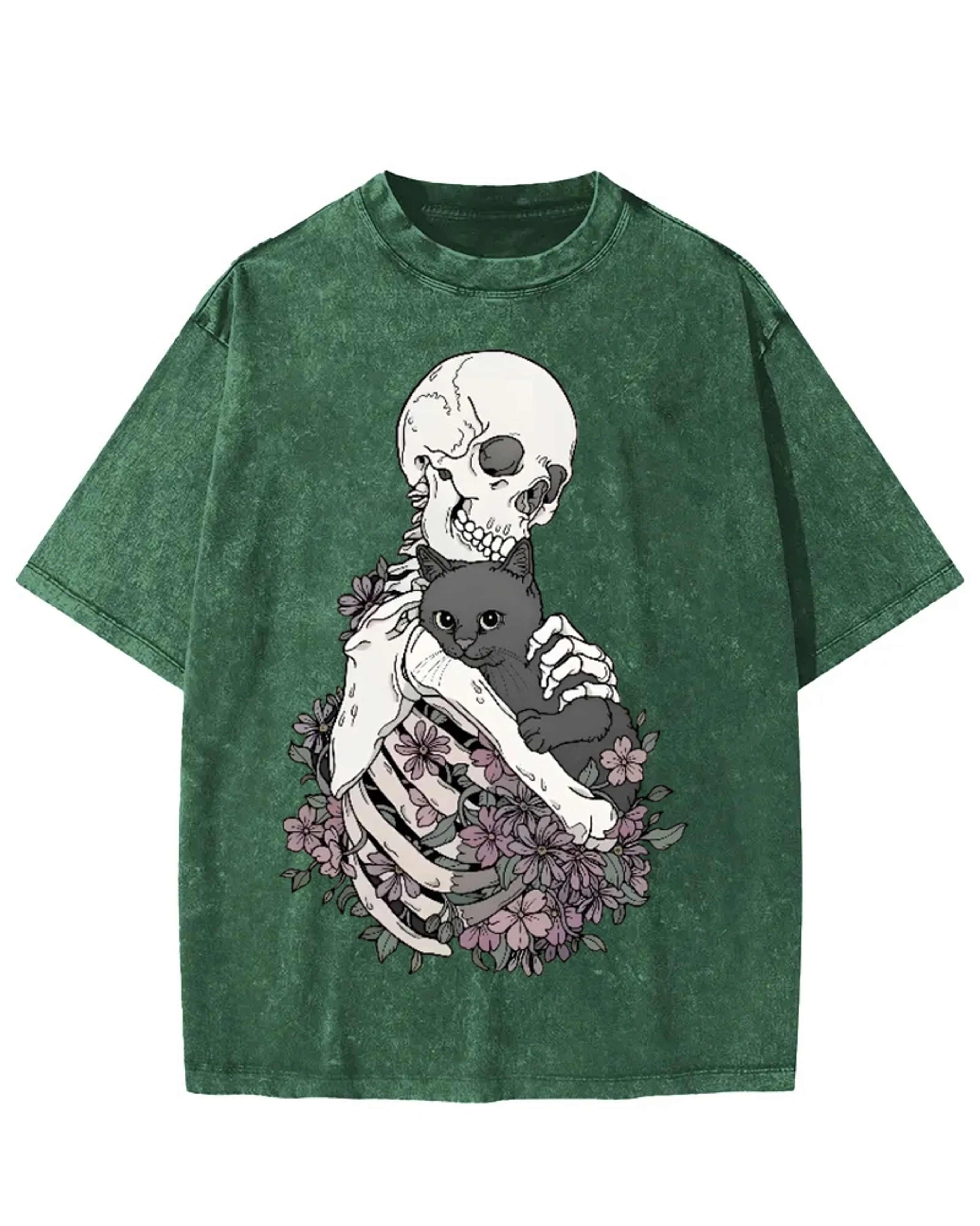 Skeleton Hugging Black Cat with Flowers Washed T-Shirt